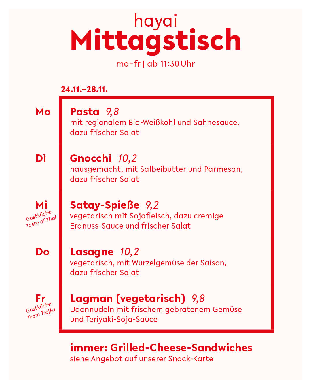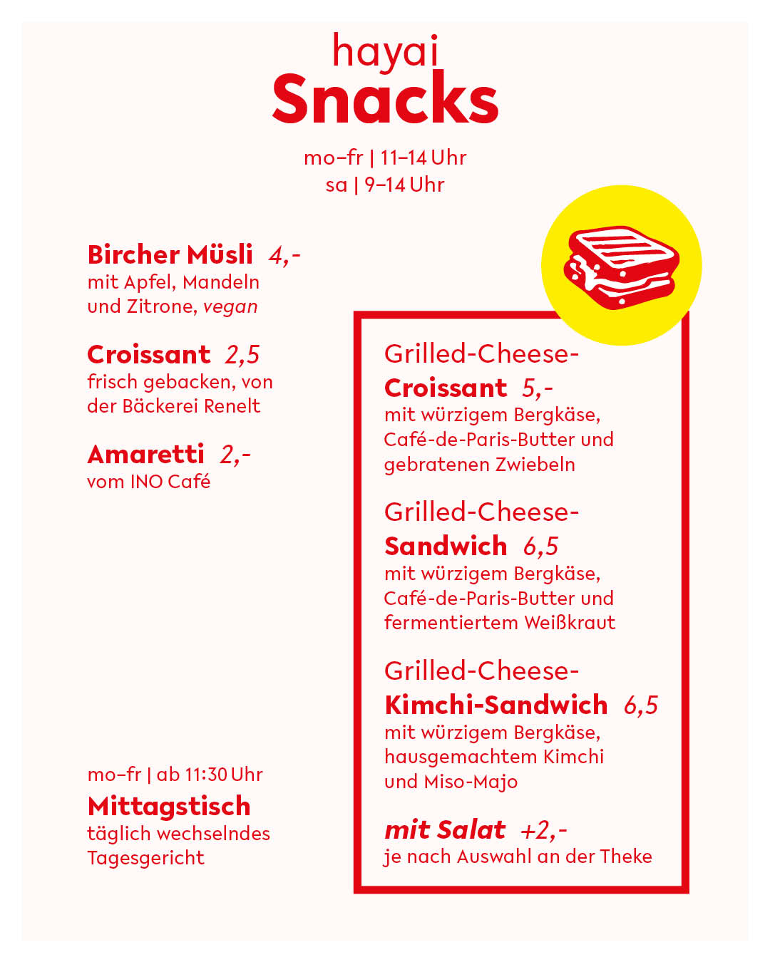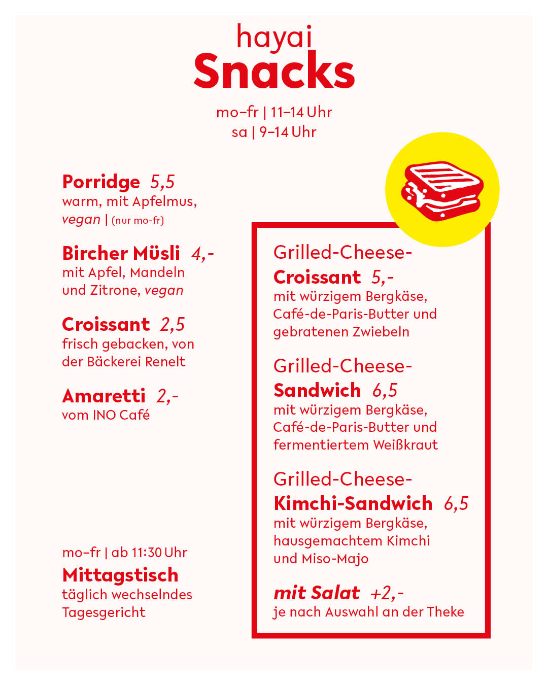 In unserem sonnigen Kantinenraum lädt hayai zu einer genussvollen Pause ein – vom Grilled-Cheese bis zum Bircher Müsli ist für jeden Geschmack etwas passendes dabei. Das täglich wechselnde Mittagsgericht geht stets mit der Saison und wird mit frischen, regionalen Zutaten gekocht. Der Raum wird geschmückt von einer Fliesenarbeit des Leipziger Künstlers Benjamin Badock.