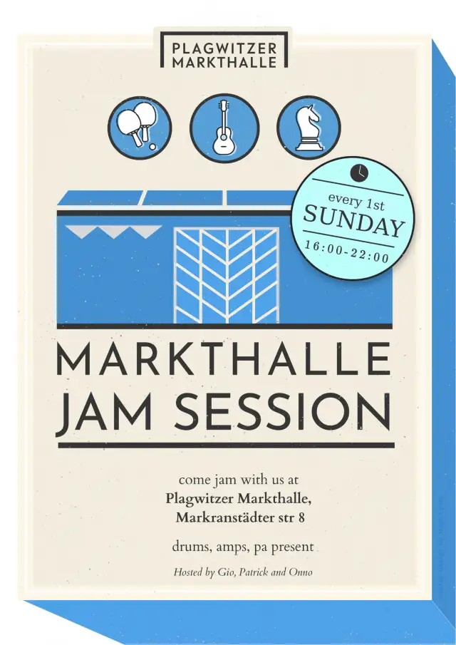 Die Markthalle öffnet ihre Türen als eine Open Jam Bühne, die Gastgeber sind die Leipziger Musiker Gio, Patrick und Onno. Selber spielen oder nur zuhören - alle sind willkommen! Neben kühlen & warmen Getränken gibt es Spiel & Spaß zum Verweilen, ausdrücklich familienfreundlich!